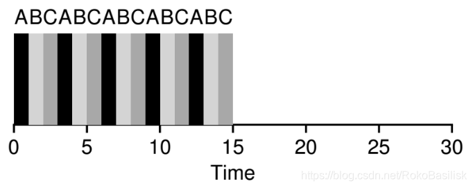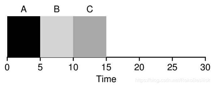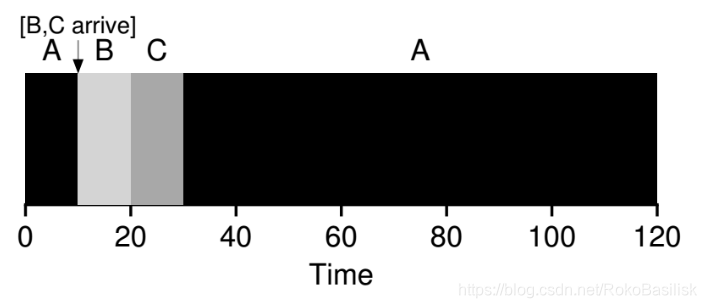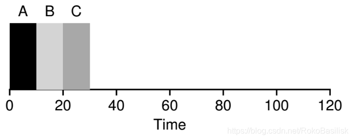 图中模拟了进程执行时间,A 在10 的位置完成,B 在20 的位置完成,C 在30 的位置完成