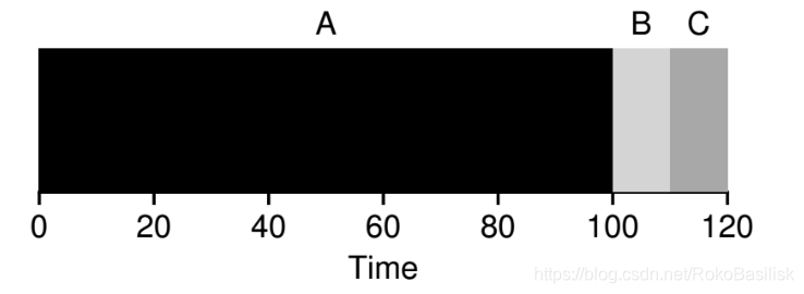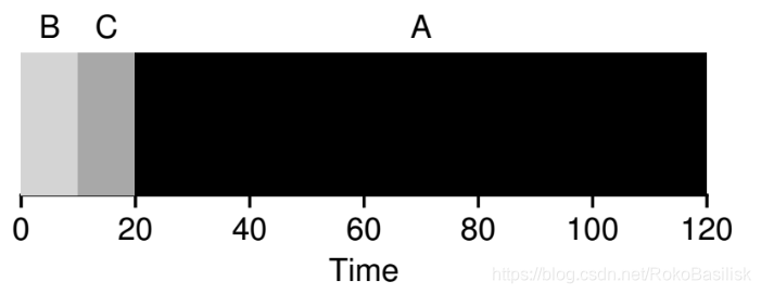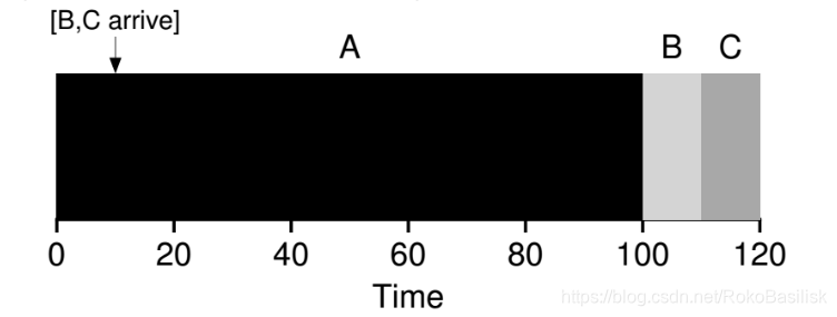 假设 A 在 t = 0 时刻到达,需要运行 100 ,而 B 和 C 在 t = 10 到达,每个需要运行 10 。