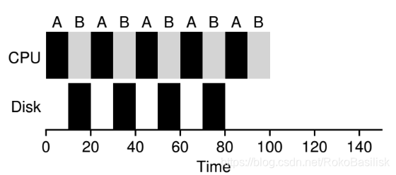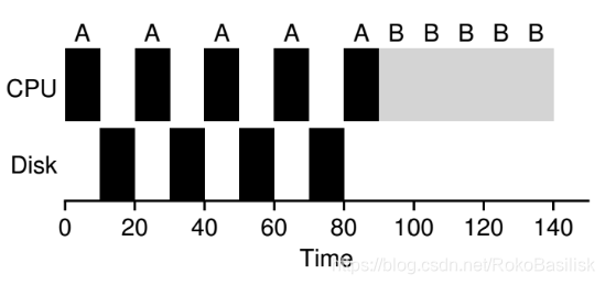 e.g. 假设有两个进程,A 和 B,每个进程都需要50毫秒的计算时间。区别在于,A 运行10毫秒,然后发出一个I/O请求( 这里假设每个I/O需要10毫秒 ),而 B 只使用50毫秒计算时间,不执行I/O。这种情形下,调度器会先运行A,然后运行B。